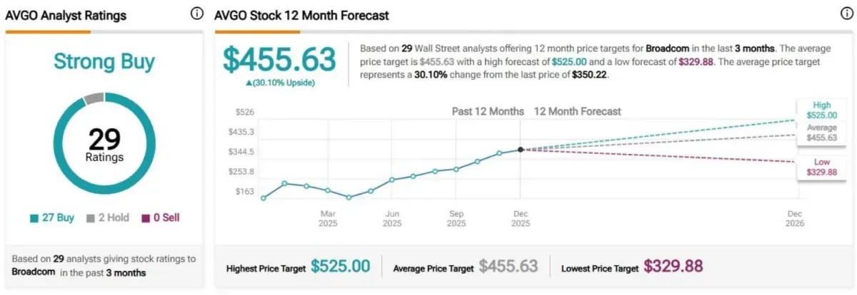 This positive sentiment is reflected in the 27 'Buy' ratings Broadcom received, with only two analysts suggesting a 'Hold'. The consensus price target is at US$455.63, offering a potential 30 percent upside opportunity for investors.