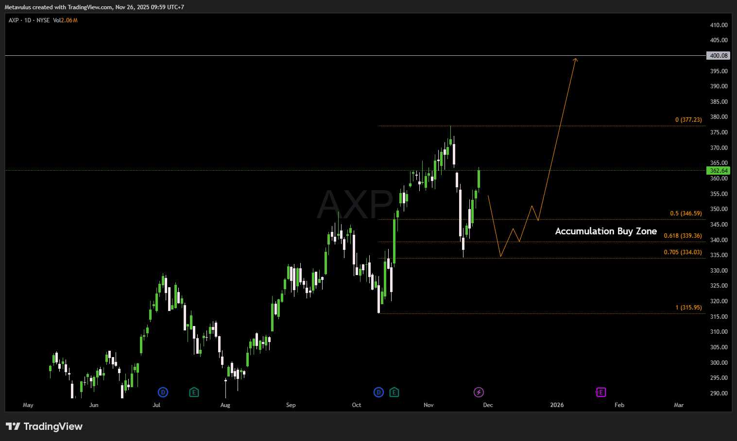 - lalu rally kembali menuju 377 → 400.