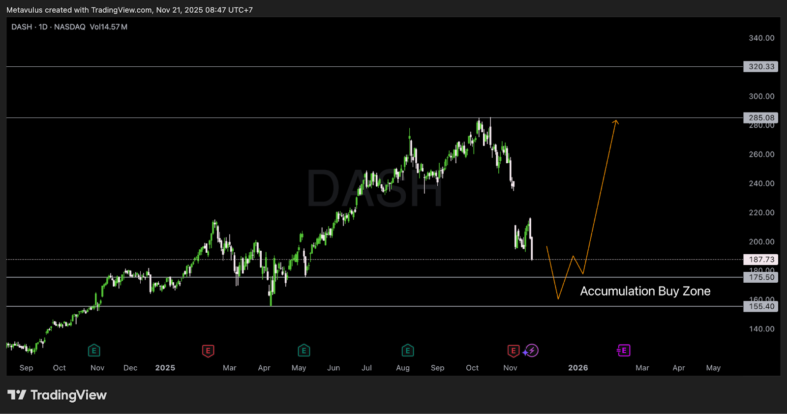 DoorDash (NASDAQ: DASH) baru saja masuk fase koreksi, turun ~30% dari puncak, padahal: