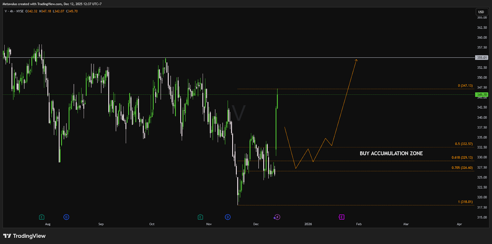 - US$326,60 (Fib 0,705) → ujung bawah BUY ACCUMULATION ZONE yang kami tandai.