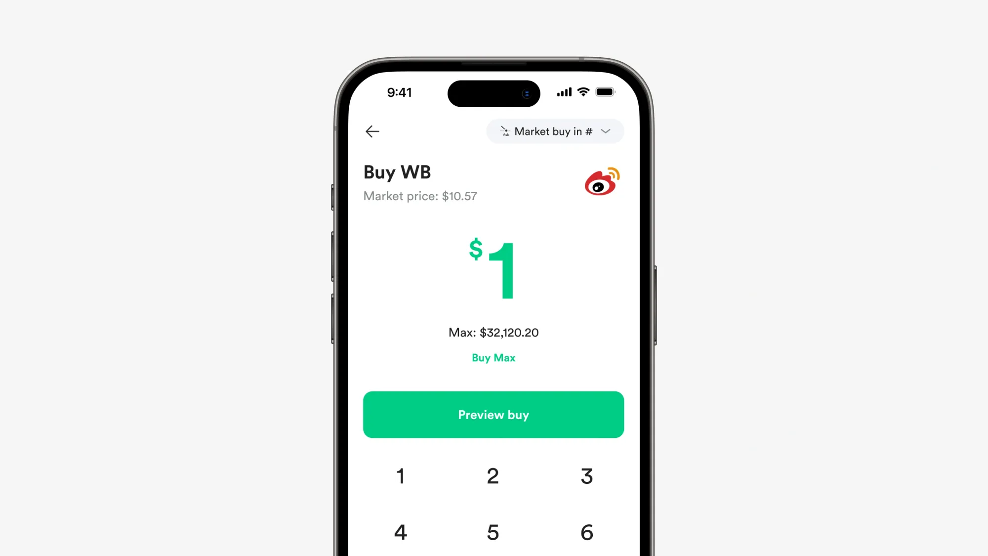 1. Buka Gotrade, cari Weibo (WB) di kolom pencarian, masuk ke halaman grafik dan pilih buy.