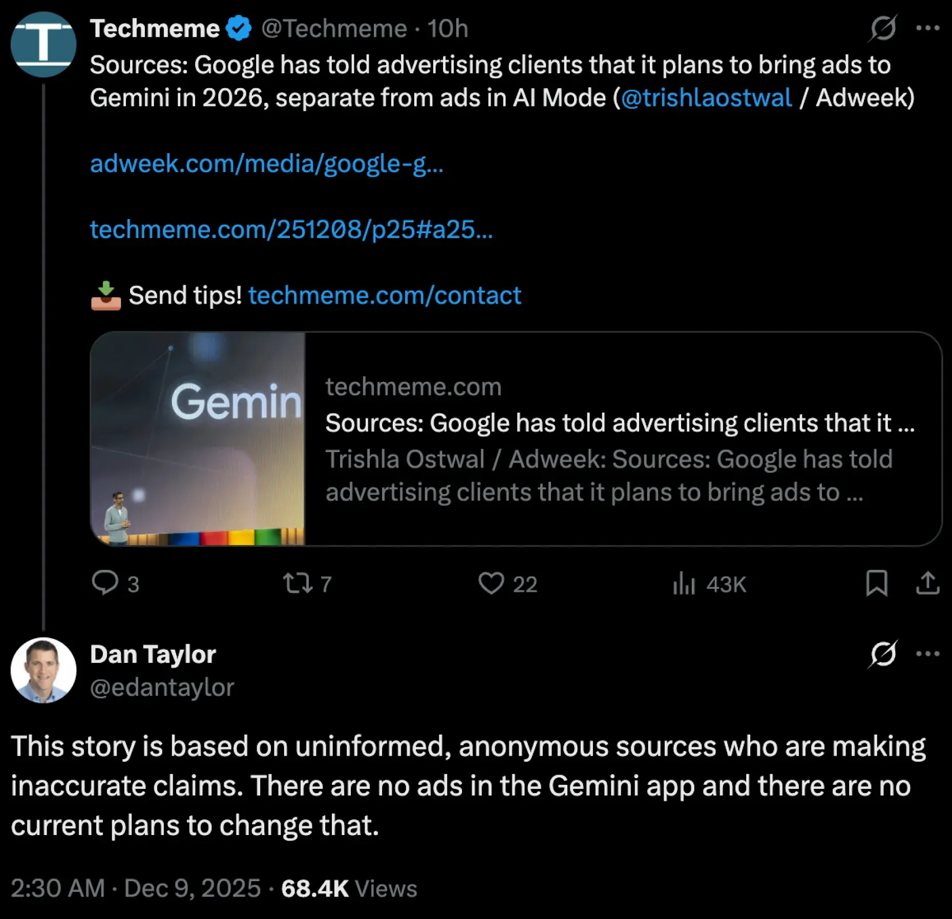 - Google denies AdWeek's report on plans for ads in Gemini.