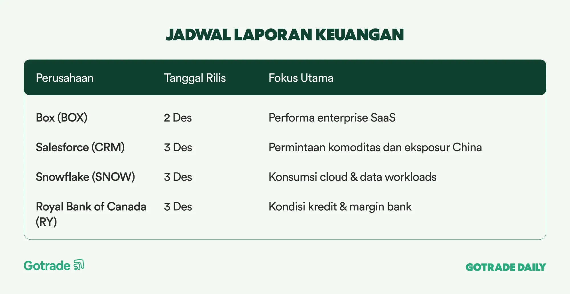 Sementara itu, sektor retail justru menjadi penopang pasar. Saham seperti Walmart, Ulta, dan ETF XRT mencatat penguatan konsisten saat musim belanja liburan masuk fase puncak. Performa ini mengisyaratkan bahwa belanja konsumen tetap kuat, memberikan keseimbangan di tengah tekanan kripto dan volatilitas teknologi. Dengan ekspektasi bahwa The Fed berpotensi memangkas suku bunga pekan depan, trader memasuki Desember dengan campuran kehati-hatian dan optimisme musiman.