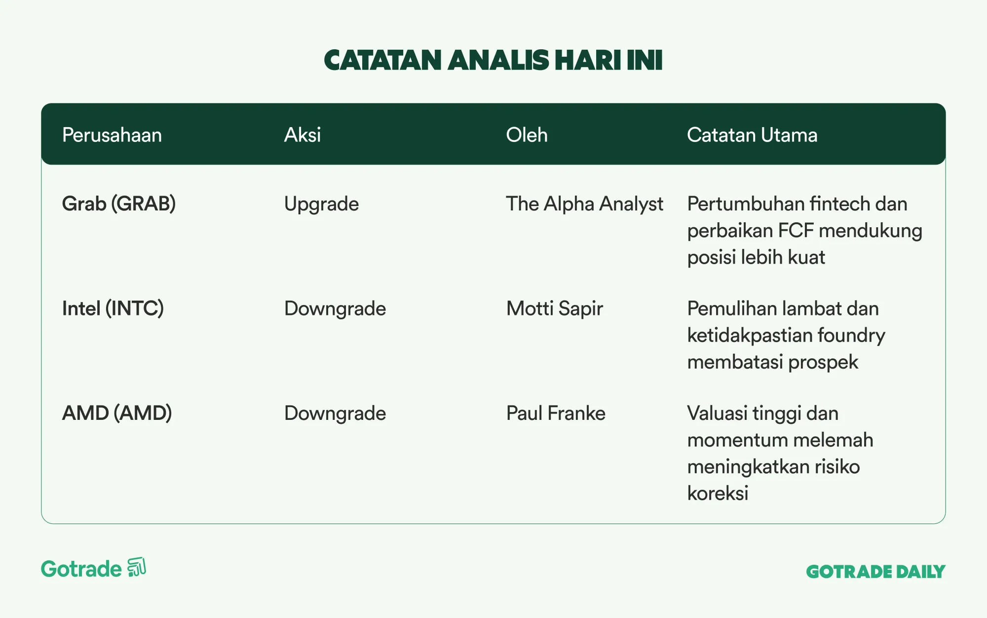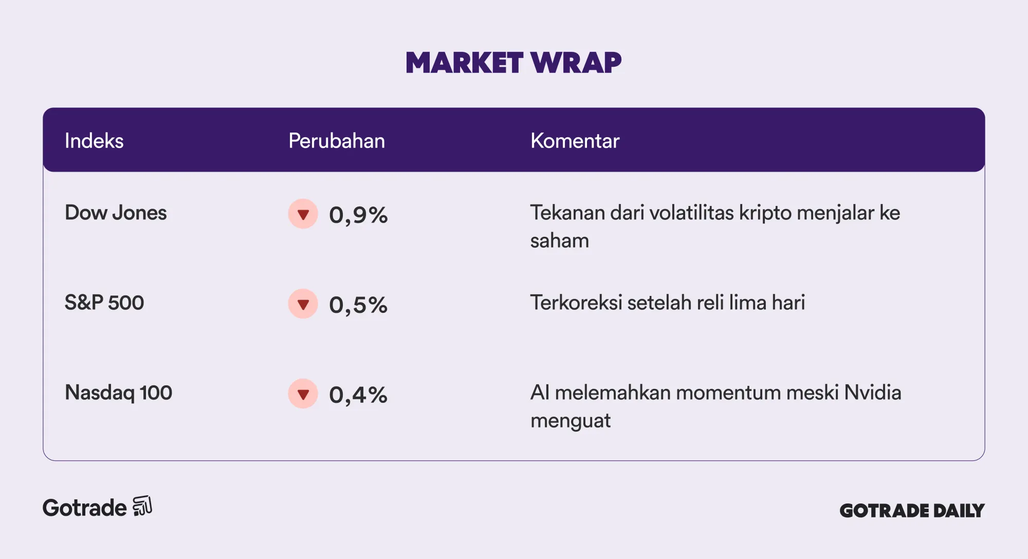 Di tengah tekanan tersebut, sektor teknologi bergerak tidak seragam. Saham-saham AI seperti Broadcom dan Super Micro Computer melemah, mencerminkan aksi ambil untung setelah reli kuat tahun ini. Namun, Nvidia (NVDA) sempat menguat lebih dari 1 persen berkat kabar investasi baru di Synopsys, menunjukkan bahwa minat terhadap nama-nama AI besar belum sepenuhnya memudar meski volatilitas meningkat.