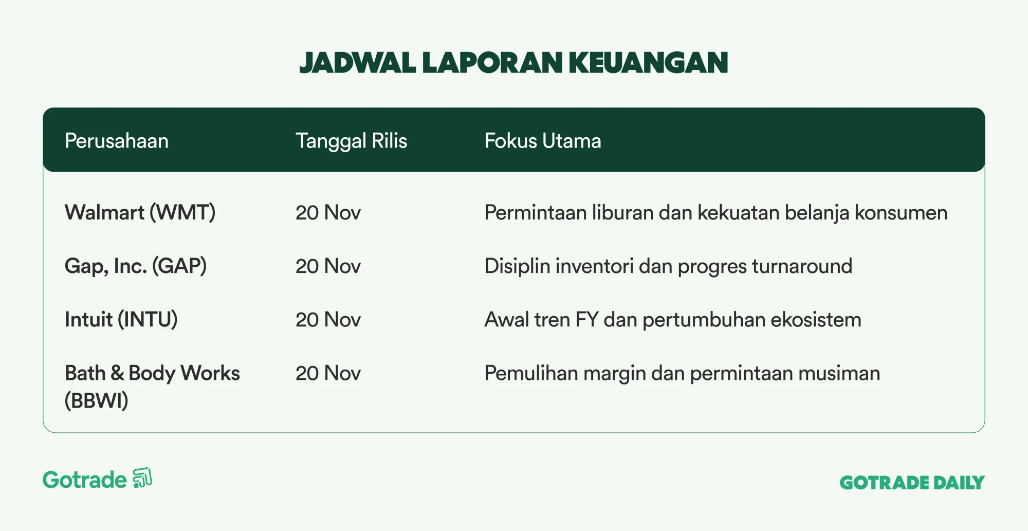 Pasar AS menguat pada Rabu setelah empat hari pelemahan yang dipimpin sektor teknologi. S&P 500 dan Nasdaq bergerak naik seiring investor mulai kembali melakukan positioning menjelang laporan pendapatan Nvidia yang dianggap sebagai salah satu katalis paling penting pada kuartal ini. Keberhasilan Alphabet meluncurkan Gemini 3 juga membantu memulihkan selera risiko, terutama pada saham mega cap yang sempat tertekan akibat volatilitas beberapa sesi terakhir.