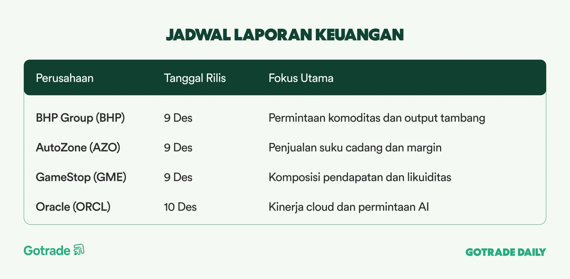 Dari sisi tenaga kerja, datanya beragam. PHK korporasi melonjak pada November, namun klaim tunjangan pengangguran mingguan turun ke level terendah sejak 2022, memberi sinyal pasar tenaga kerja mendingin namun tidak melemah drastis. Sesi perdagangan juga dipengaruhi oleh berita akuisisi Netflix, sementara saham berkapitalisasi besar bergerak stabil menjelang pekan yang dipenuhi rilis data dan keputusan FOMC terakhir tahun ini.
