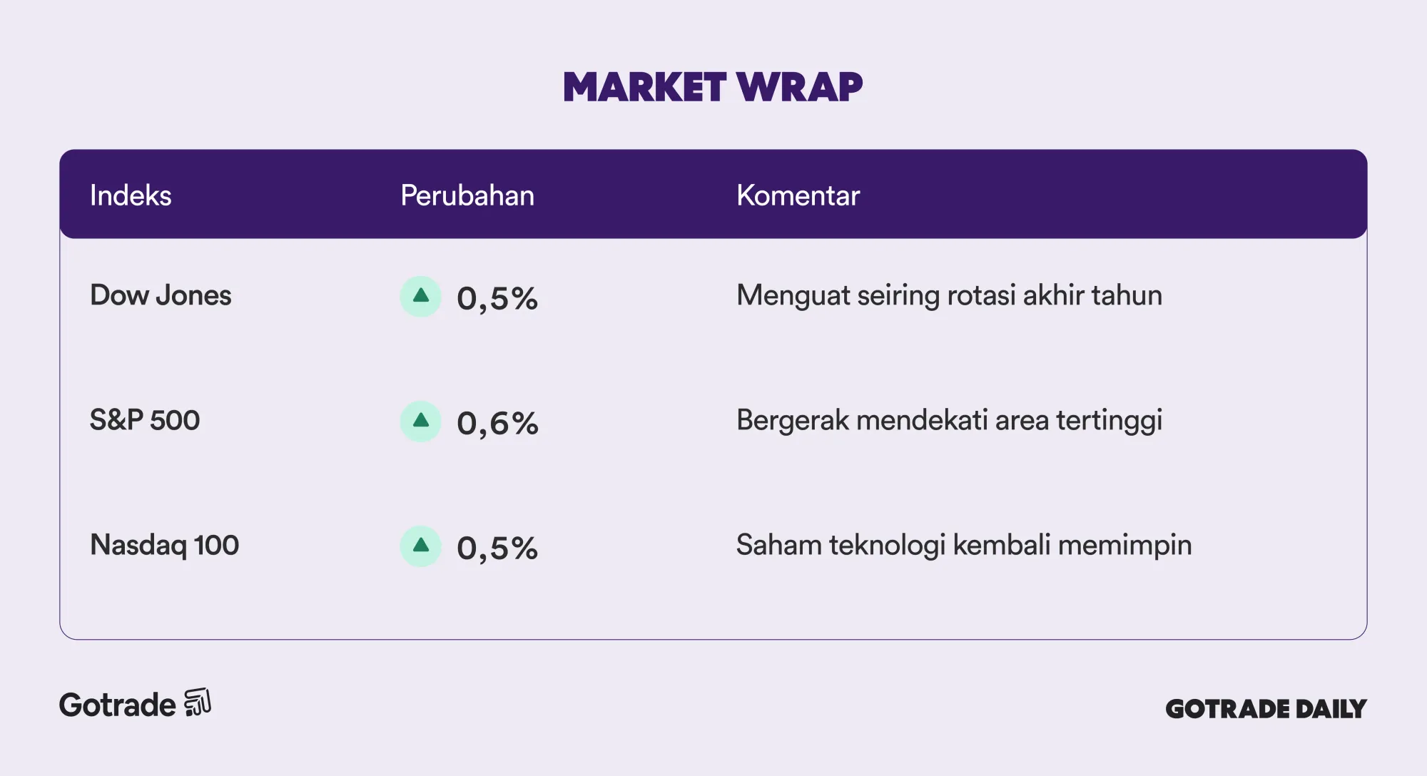Pasar saham AS kembali menguat memasuki pekan perdagangan yang dipersingkat libur Natal. Dow Jones, S&P 500, dan Nasdaq 100 sama sama mencatat kenaikan untuk hari ketiga berturut-turut, menandakan sentimen risk on mulai kembali terbentuk menjelang penutupan tahun.