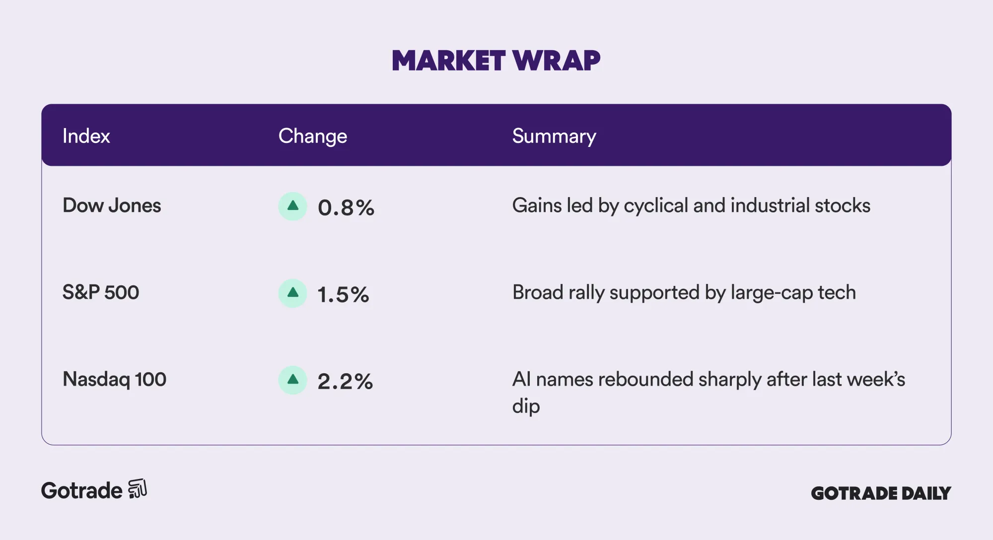The Dow rose 0.8%, the S&P 500 gained 1.5%, and the Nasdaq jumped 2.2% as AI leaders like Nvidia, Broadcom, and Microsoft helped fuel a broad rebound.