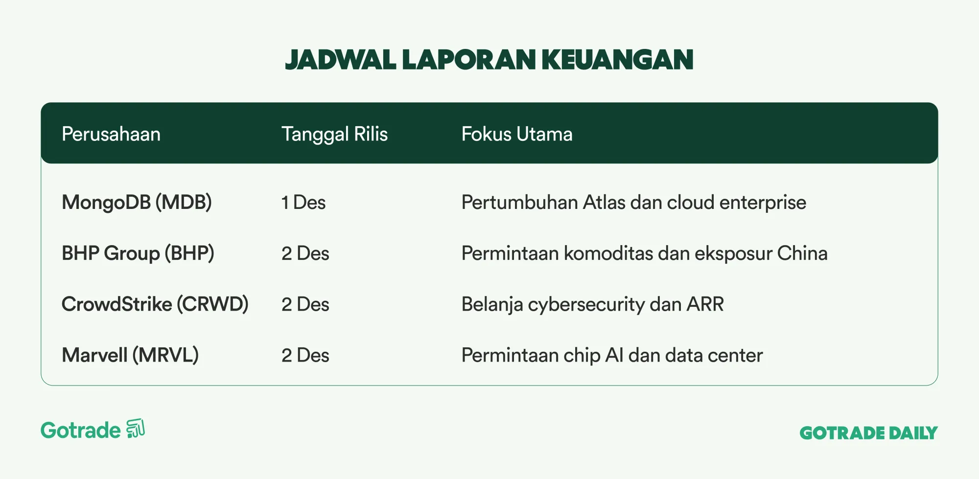 Rilis data makro diperkirakan kembali normal setelah penundaan akibat penutupan pemerintahan 43 hari, dengan laporan manufaktur, jasa, dan ADP payrolls menjadi sorotan. Dari sisi korporasi, raksasa ritel diskon seperti Dollar Tree, Dollar General, dan Five Below akan mengukur ketahanan konsumen, sementara Salesforce (CRM) dan CrowdStrike (CRWD) menjadi indikator permintaan software dan keamanan siber.