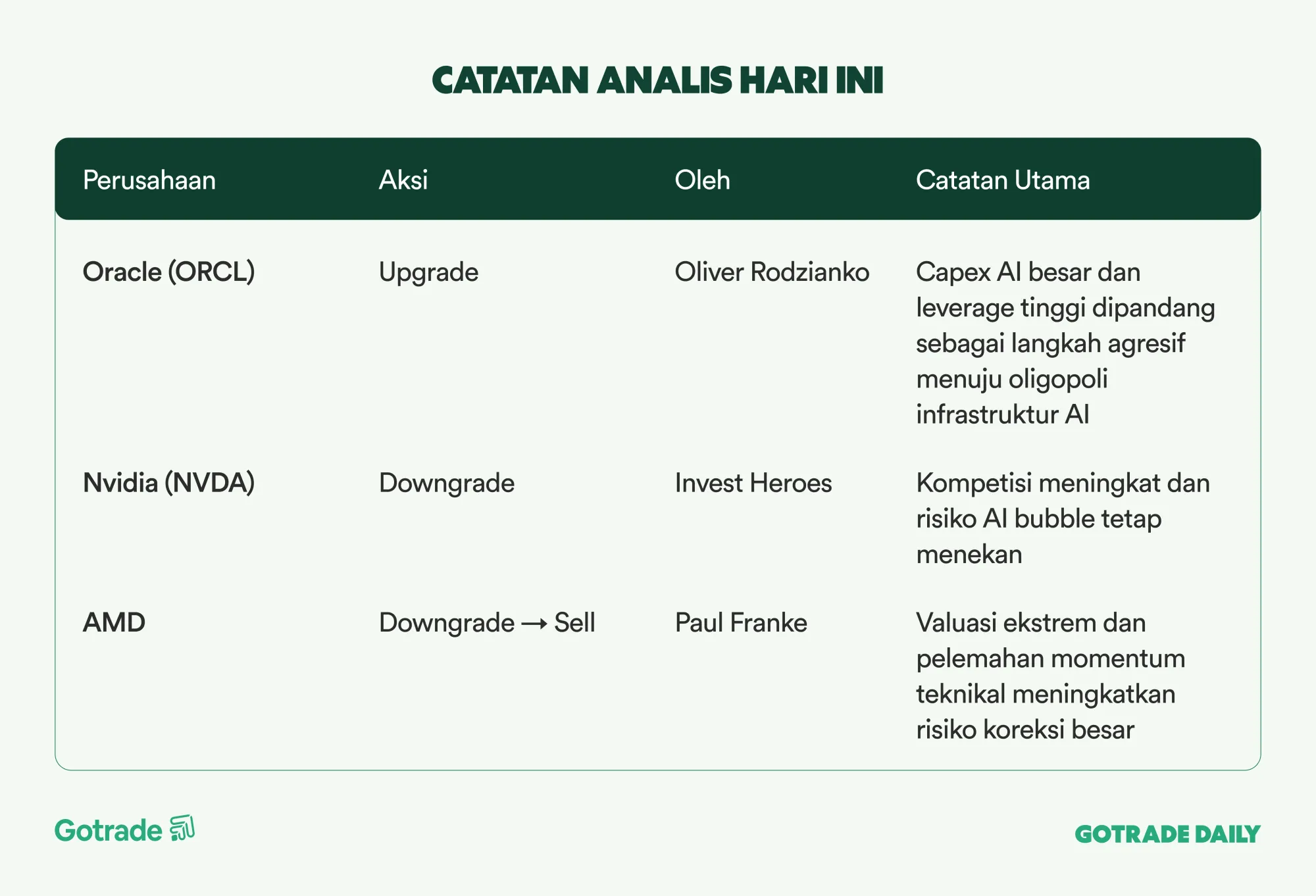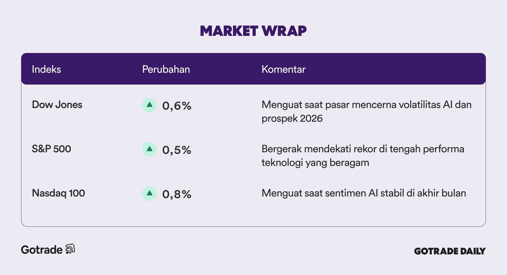 Pasar saham AS membuka Desember dengan pergerakan yang kembali mendekati level tertinggi setelah November yang bergejolak. S&P 500, Dow Jones, dan Nasdaq semuanya berada tidak jauh dari rekor meskipun tren bulanan sempat terganggu. Di bawah permukaan, performa saham AI terpecah, dengan Meta (META), Nvidia (NVDA), dan Oracle (ORCL) tertekan, sementara Alphabet (GOOG) memimpin kenaikan berkat antusiasme terhadap Gemini 3 dan potensi kerja sama chip AI dengan Meta.