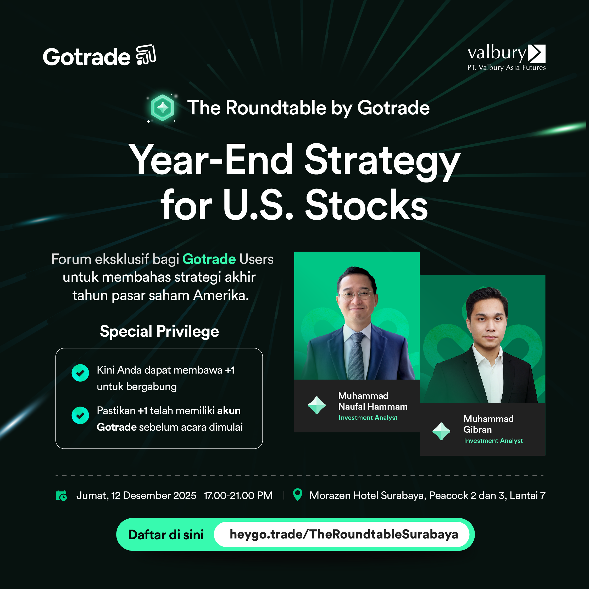 Untuk memahami bagaimana kondisi ini harus membentuk year-end strategy kamu, The Roundtable by Gotrade di kota Surabaya adalah kesempatan terbaik untuk belajar langsung dari analis dan membawa pulang strategi yang lebih terstruktur untuk menyambut 2026.