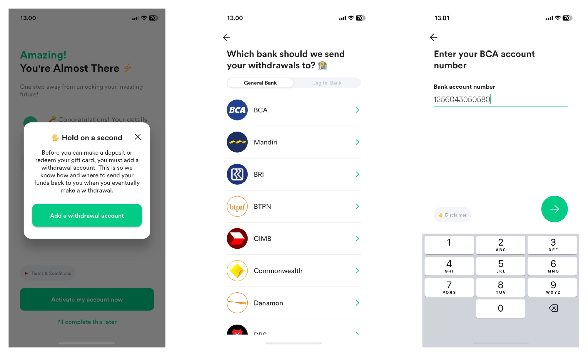 Caranya mudah, tinggal tekan tombol "Add a withdrawal account", lalu pilih bank, dan tambahkan rekeningnya. Kamu akan melihat beberapa opsi dari bank-bank besar di Indonesia.