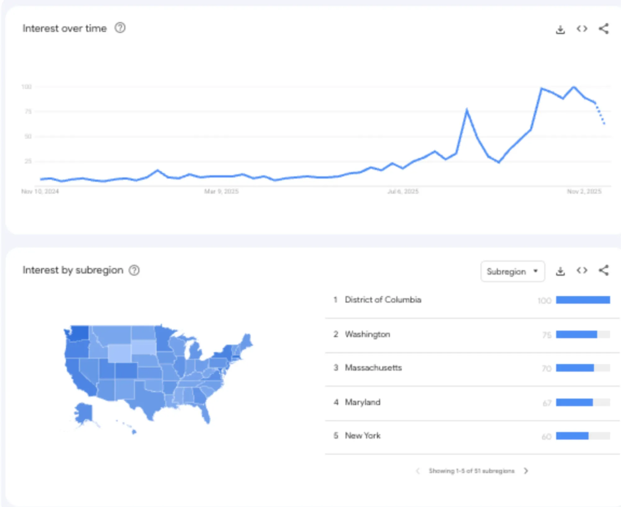 Menariknya, lonjakan pencarian ini paling terlihat di wilayah-wilayah yang menjadi pusat kebijakan dan teknologi, seperti District of Columbia, Washington, Massachusetts, Maryland, dan New York.