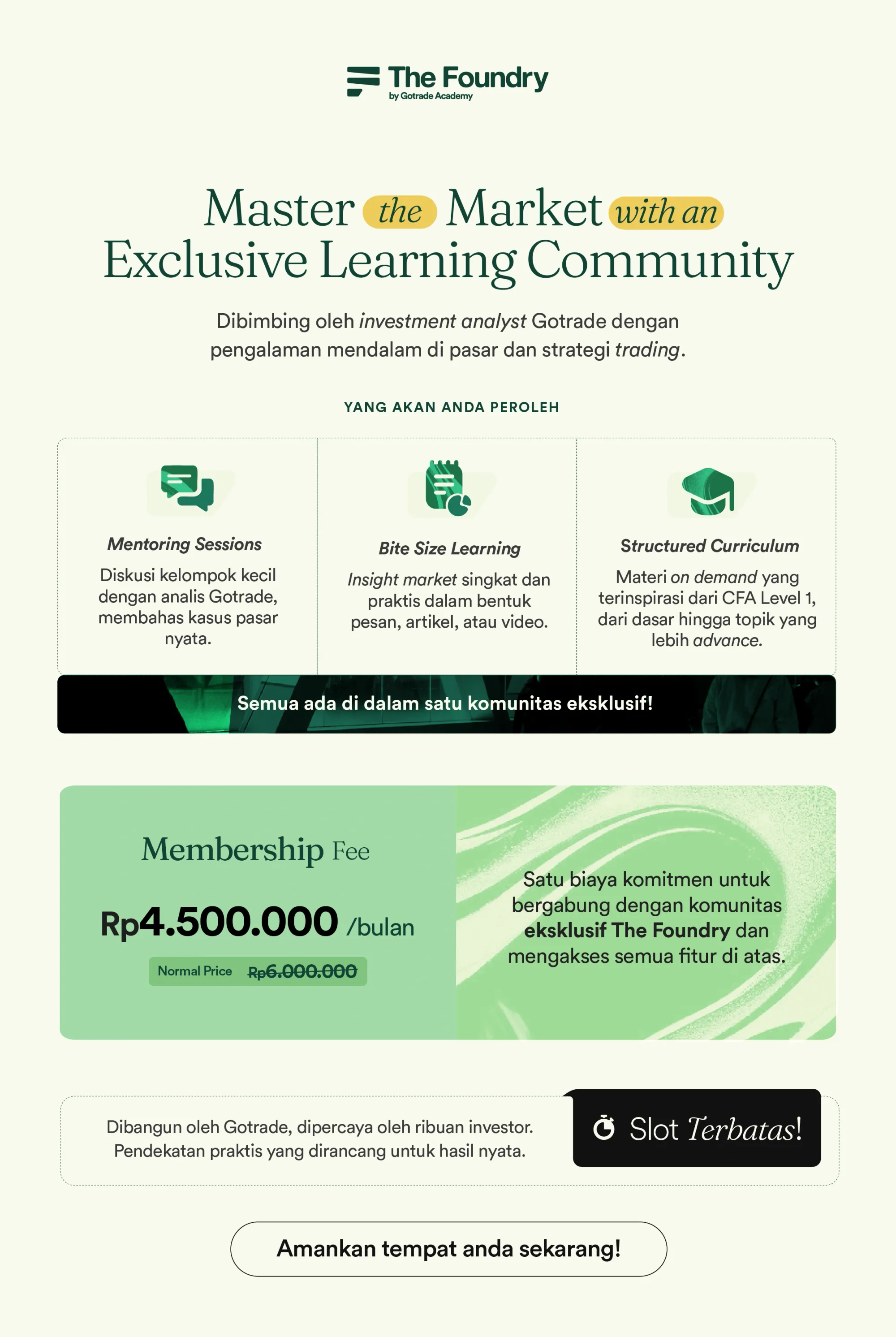 Jika kamu ingin belajar investasi, memahami cara memilih saham pertama secara lebih terstruktur, dan tidak hanya mengandalkan rekomendasi acak, The Foundry by Gotrade Academy hadir sebagai komunitas belajar investasi dan trading berbasis edukasi.